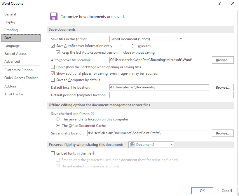 In the Options dialog box select Save from the left-hand menu. Note the Auto Recover files location.
